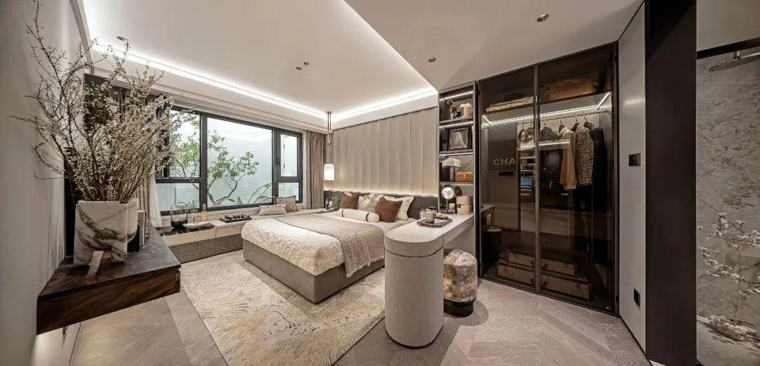 样板间实拍主卧的L型步入式衣帽间,女主人能买买买无负担,再也不用发愁过季的衣服无处安放。