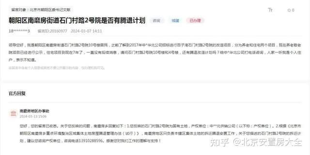 您好,您的留言已收悉。关于您反映的问题,南磨房乡回复如下:1.您反映的石门村路2号院为国有土地,产权单位:中**北供销公司(以下称:产权单位)。2.根据《北京市朝阳区南磨房乡重点环境整治区域集体土地房屋腾退管理办法(试行)》,南磨房地区只负责本辖区集体土地的拆迁腾退安置工作,关于您描述的石门村路2号院的拆迁计划,建议您咨询产权单位,咨询电话。感谢您对我们工作的理解与支持!