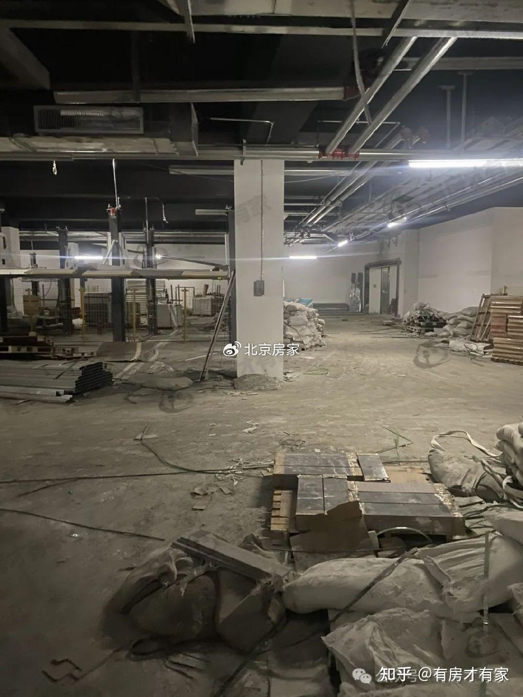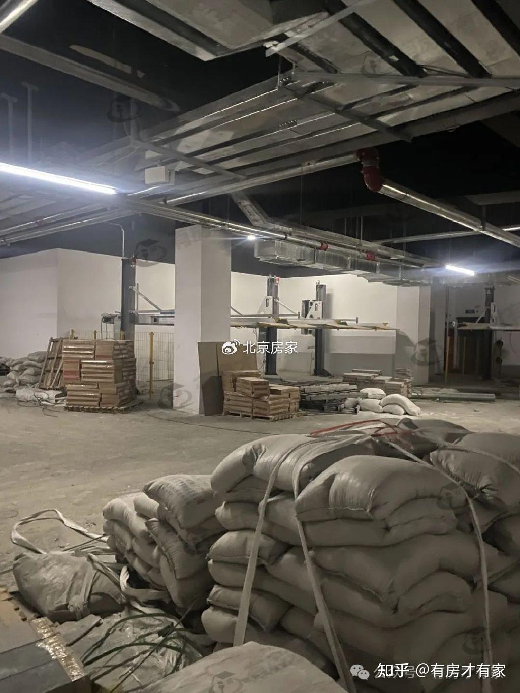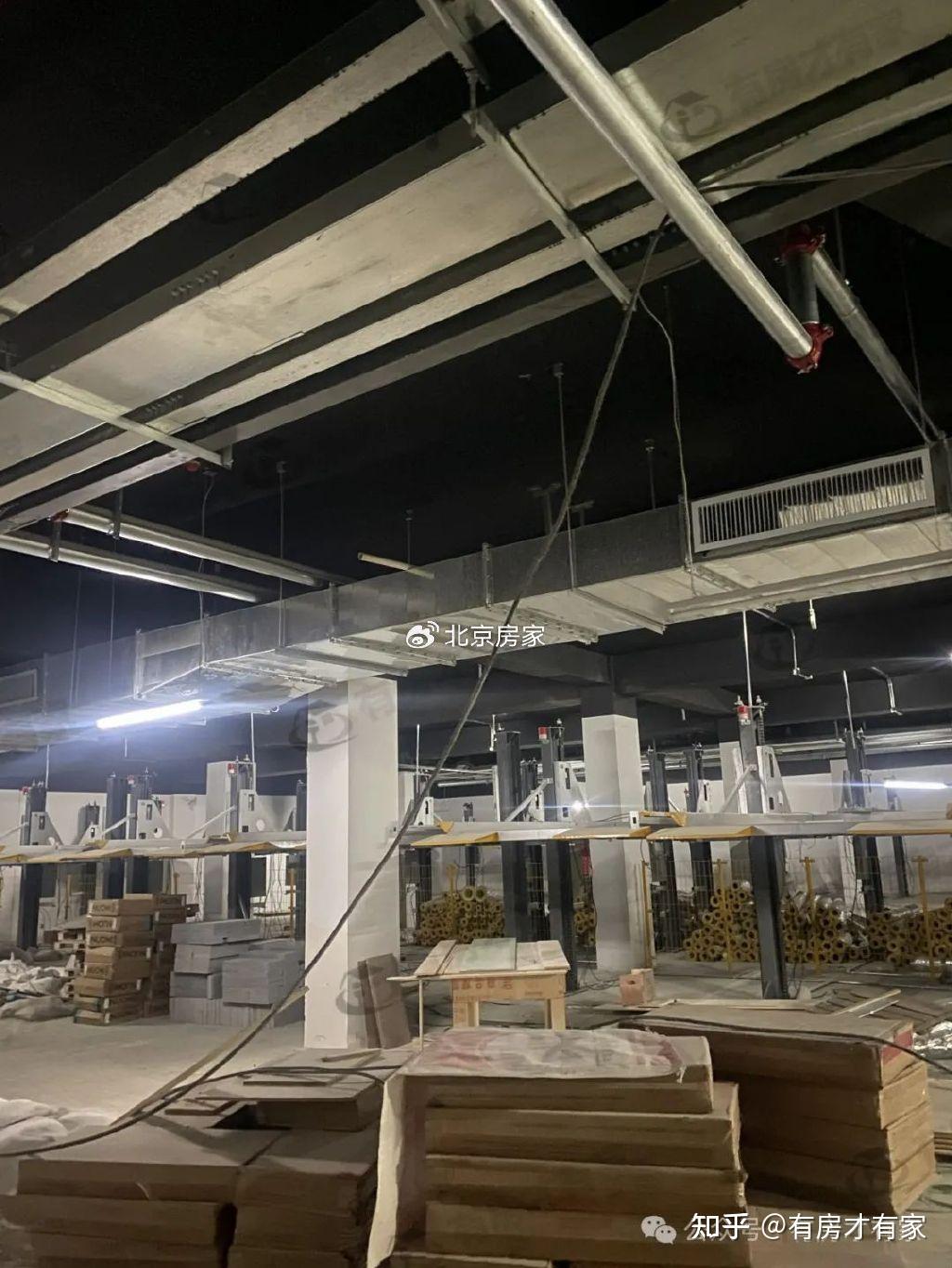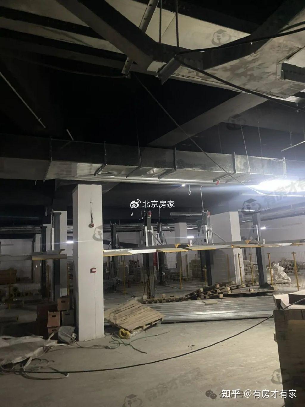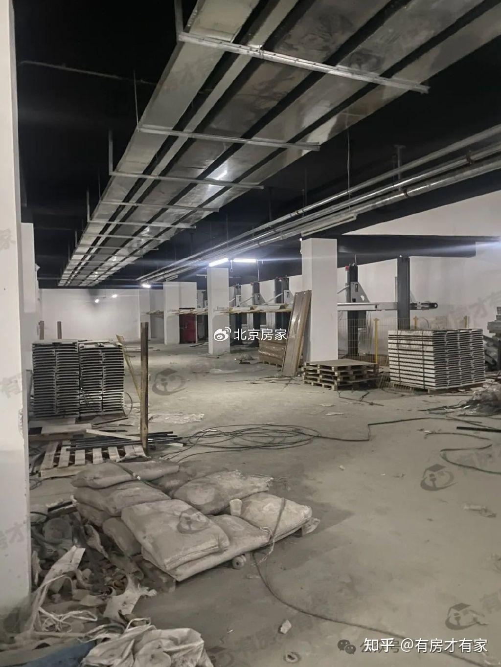 公共区域墙壁已经装修好了,地下车库各个角度实拍,地面还堆放了很多施工材料。