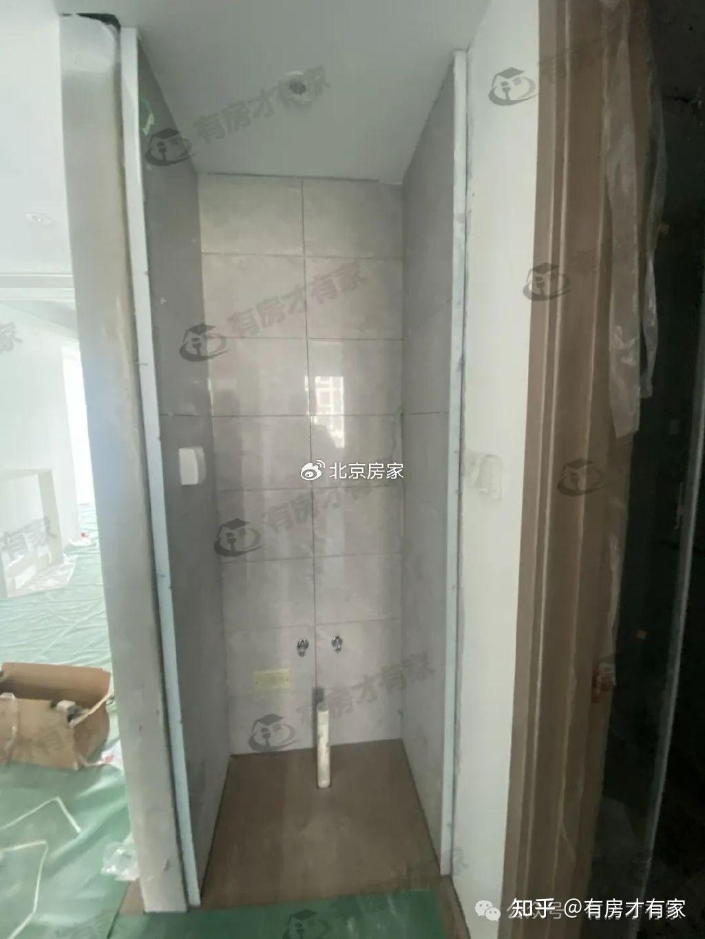 地面覆盖着保护膜,厨房内放了一些板材,下一步就要安装橱柜了,卫生间安装了马桶、花洒和淋浴房,只有洗手池还未安装。
