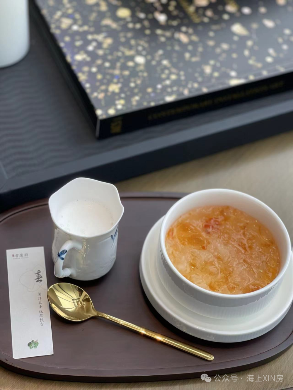 在洽谈区,服务人员会贴心咨询需要的饮品和食物,而且饮品的水准是图片里这种,而且据说每周都会持续推出定制款茶饮和下午茶,堪比五星级酒店服务。