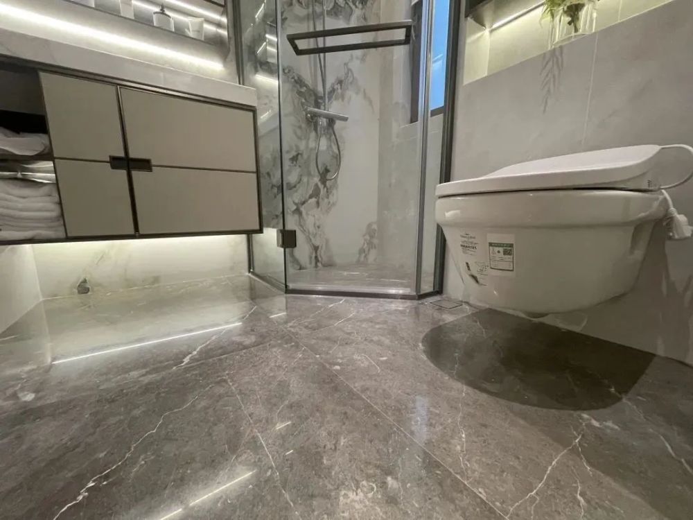 笔者观察到,中环金茂府的卫生间很有特点,几乎没有留下任何卫生死角。入墙的马桶,不但更加节水静音,而且大大减少藏污纳垢的空间。