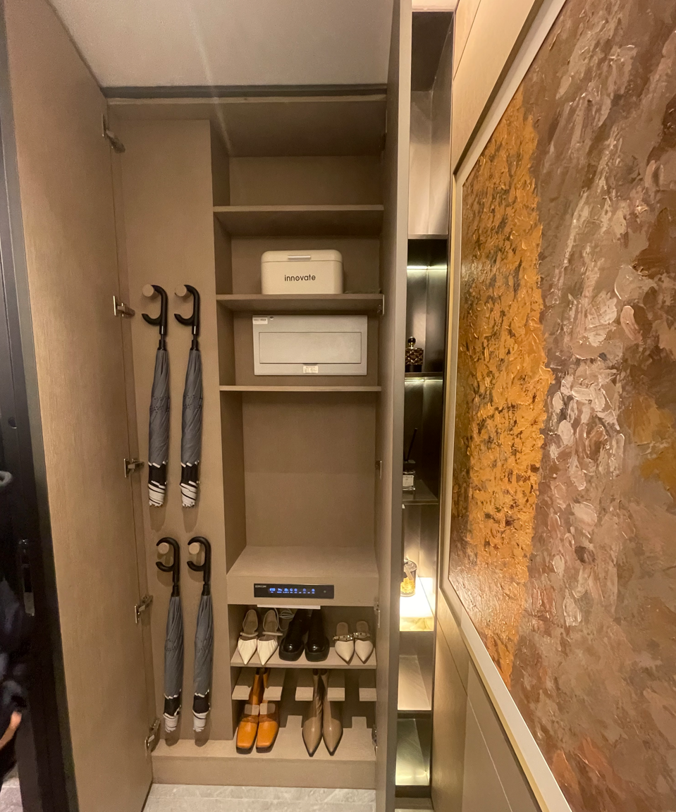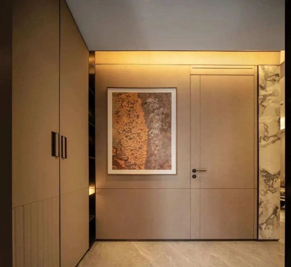 看似简单的入户玄关,富含了多种的复合储物空间配置,结合金属格栅和柔和灯光的融合处理,让归家的第一个动作都显得更加优雅从容。