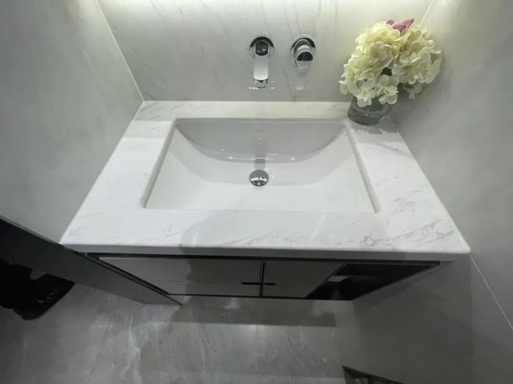 其次,淋浴间的通顶岩板、厨房间的无缝岩板,大气的材料运用,均营造出更强的通透感。