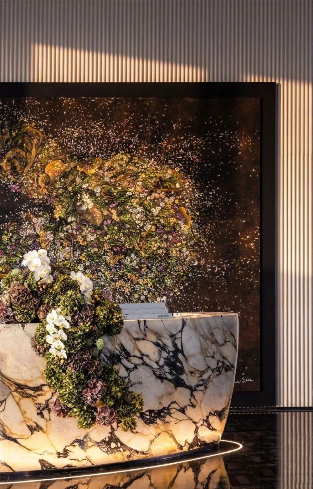石材接待台背后,高定的植株以及兰花壁画,远看宛如一幅优雅画卷,优雅的氛围感不输奢侈酒店。