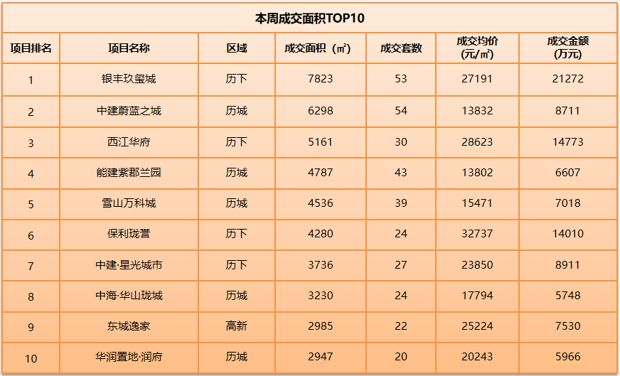 3月18日-3月24日,本周商品住宅签约面积TOP10,银丰玖玺城、中建蔚蓝之城分别位于榜单的第一、第二名。