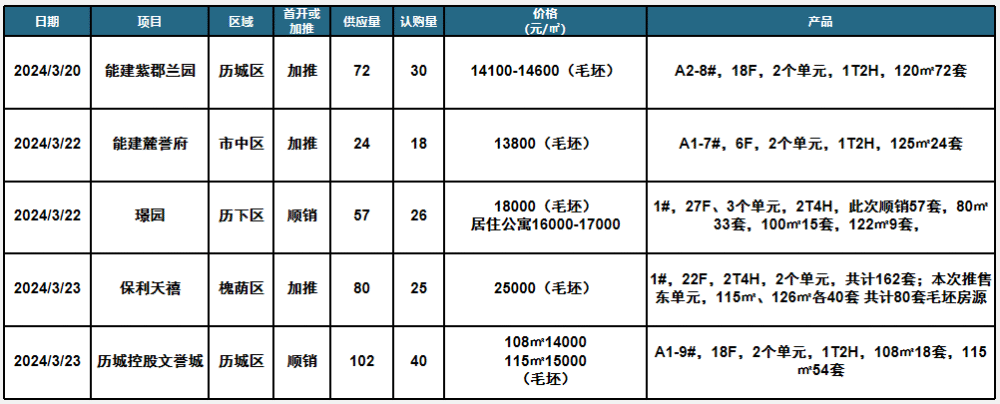 3月18日-3月24日,济南共5个项目开盘,推335套房源,去化139