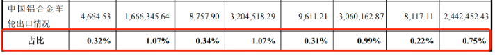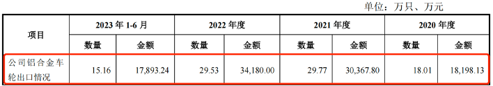 2020年-2023年上半年(以下简称“报告期”),宏鑫科技铝合金车轮出口数量分别为18.01万只、29.77万只、29.53万只、15.16万只,占我国铝合金车轮出口数量的0.22%、0.31%、0.34%和0.32%。