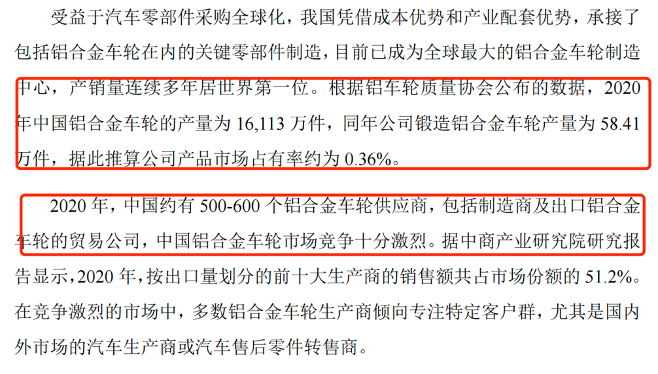 根据铝车轮质量协会公布的数据,2020年我国铝合金车轮的产量为16113万件,同年宏鑫科技锻造铝合金车轮产量为58.41万件,据此推算公司产品市场占有率仅约为0.36%。