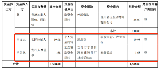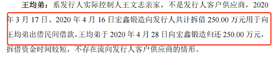 此外,宏鑫科技也曾经向王怡安以及王武杰拆出资金。且王文志的亲家王均弟也通过关联公司宏鑫锻造借出250万元。