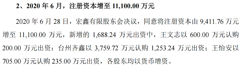 2020年6月28日,宏鑫有限股东会决议,同意将注册资本由9411.76万元增至1.11亿元。新增的1688.24万元出资中,王文志以600万元认购200万元出资;其女王怡安以705万元认购235万元出资;台州齐鑫企业管理咨询合伙企业(有限合伙)(以下简称“台州齐鑫”)以3759.72万元认购1253.24万元出资。