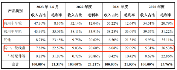 值得一提的是,报告期内,商用车车轮毛利率分别为20.79%、12.64%、12.04%和8.16%,报告期内下降了12.63个百分点。此外,绞线盘的毛利率也在报告期内下滑13.96个百分点。