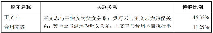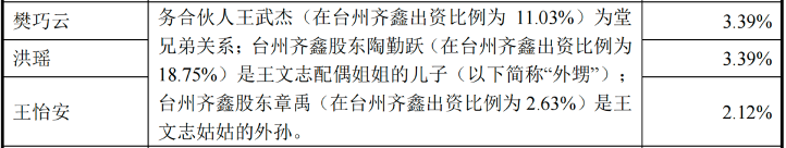 台州齐鑫股东陶勤跃(在台州齐鑫出资比例为18.75%)是王文志配偶姐姐的儿子,并担任定制改装中心负责人;台州齐鑫股东章禹(在台州齐鑫出资比例为2.63%)是王文志姑姑的外孙,担任PMC部经理一职。