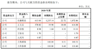 招股书显示,2020年,宏鑫科技曾多次向关联方拆出资金。其中,王文志本人于2020年拆出19.98万元用于还房贷,洪崇恩也拆出1.68万元用于关联方资金周转。