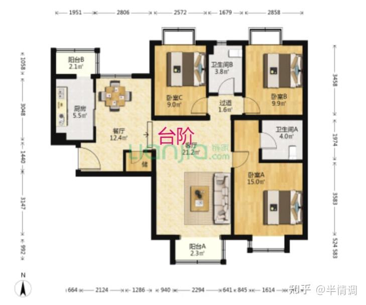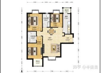 三居室占比25%左右,都是南北通透的户型,其中126平米的三居户型,是错层的设计,屋里有两节台阶,这个我们不太能接受,对老人和小孩都不太友好。