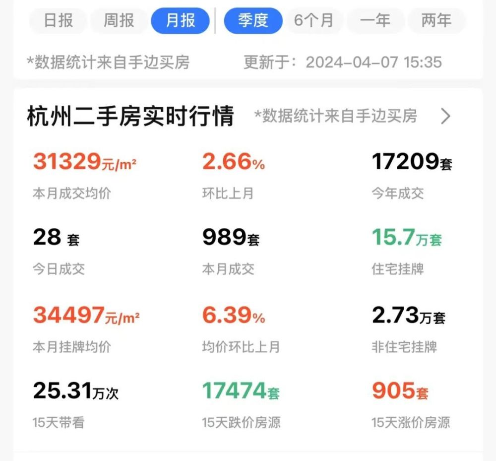 据手边买房数据显示,新政后至今,杭州二手房住宅挂牌量增加约2万套,不少房东想趁小阳春节点将房源出手。15天带看量高达约26万次,相比新政前数据,15天带看量只有约21万次,日均带看量上涨约3300次。3月二手房价止跌企稳,环比2月上涨约6%,再度站上3万/㎡。