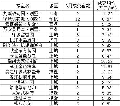 至于别墅方面,成交量就相对较低。之江板块九溪玫瑰园成交2套,其中一套建筑面积约410㎡的房源以7280万元成交;云栖蝶谷成交1套,建筑面积339.71㎡成交价4700万元。余杭区的绿城桃花源成交12套,面积段在270-380㎡的独栋别墅,总价基本在1900-3000万元之间。