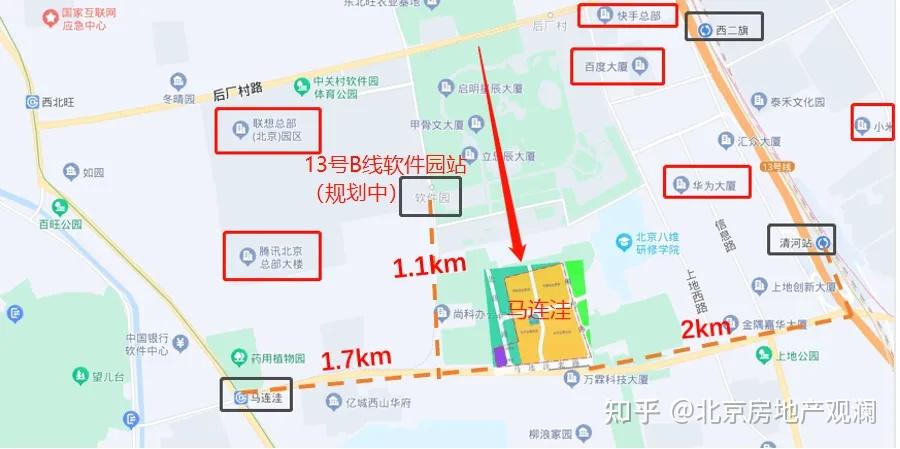地块距离各个地铁站都超过1公里,但这位置简直是后厂村的C位!周边都是互联网大厂,妥妥的宇宙中心既视感,腾讯、新浪、网易、百度、联想、快手、华为等等聚集的中关村软件园就在家门口,可以腿着上班,绝对不愁卖。