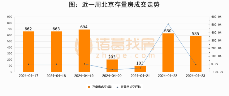 从存量房来看,2024年04月23日北京存量房单日成交585套,比昨日减少45套,环比下降7.1%。从近一周存量房成交来看,北京存量房日均成交套数为505套,04月23日单日成交585套,高于近一周平均水平15.8%。