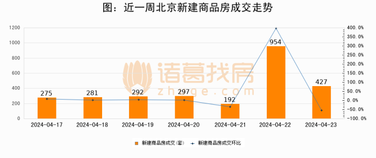 根据北京市住房和城乡建设委员会数据显示,2024年04月23日北京新建商品房成交427套,较昨日减少527套,环比下降55.2%。近一周北京新建商品房日均成交389套。04月23日单日成交427套,高于近一周平均水平9.8%。