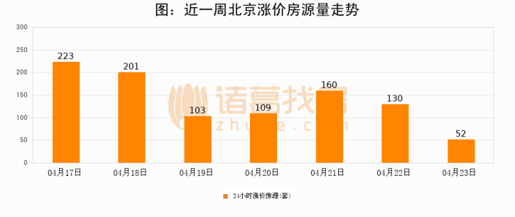根据诸葛找房数据显示,北京24小时涨价房源量为52套,较04月22日减少78套,环比下降60%。与此同时,涨价房源占比小幅回落,对于购房者来说是一个入市窗口期,购房者可抓住时机入市。