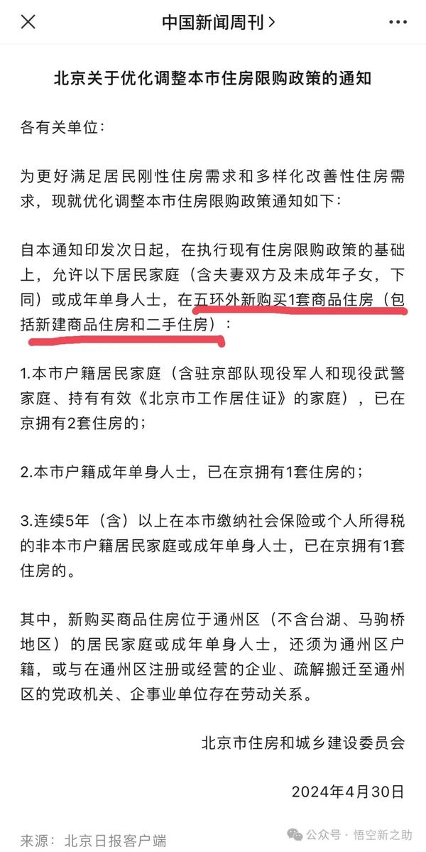 简单来说就是北京放宽五环外的购房限制,你没听错,就是五环外,是不是有点给北京五环外房地产清库存的意思?