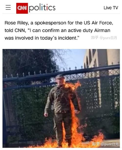CNN称,确认自焚男子身份的,是美国空军的发言人罗斯·莱利。她表示她可以确认涉及此案的男子是一名美国空军的现役军人。