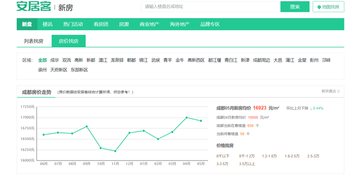 根据安居客发布的成都房价走势,成都5月新房均价16923元/㎡,较4月新房均价16998元/㎡,环比下降0.44%。