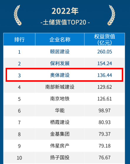 据克而瑞数据,2022年,奥体建设以136.44亿元权益货值排在南京房企第三位,仅次于颐居建和保利发展。