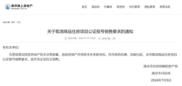 7月5日晚,南京市住房保障和房产局、南京市司法局联合发布《有关取消商品房项目公证摇号销售要求的通知》,即日起,南京取消商品住房公证摇号销售要求。